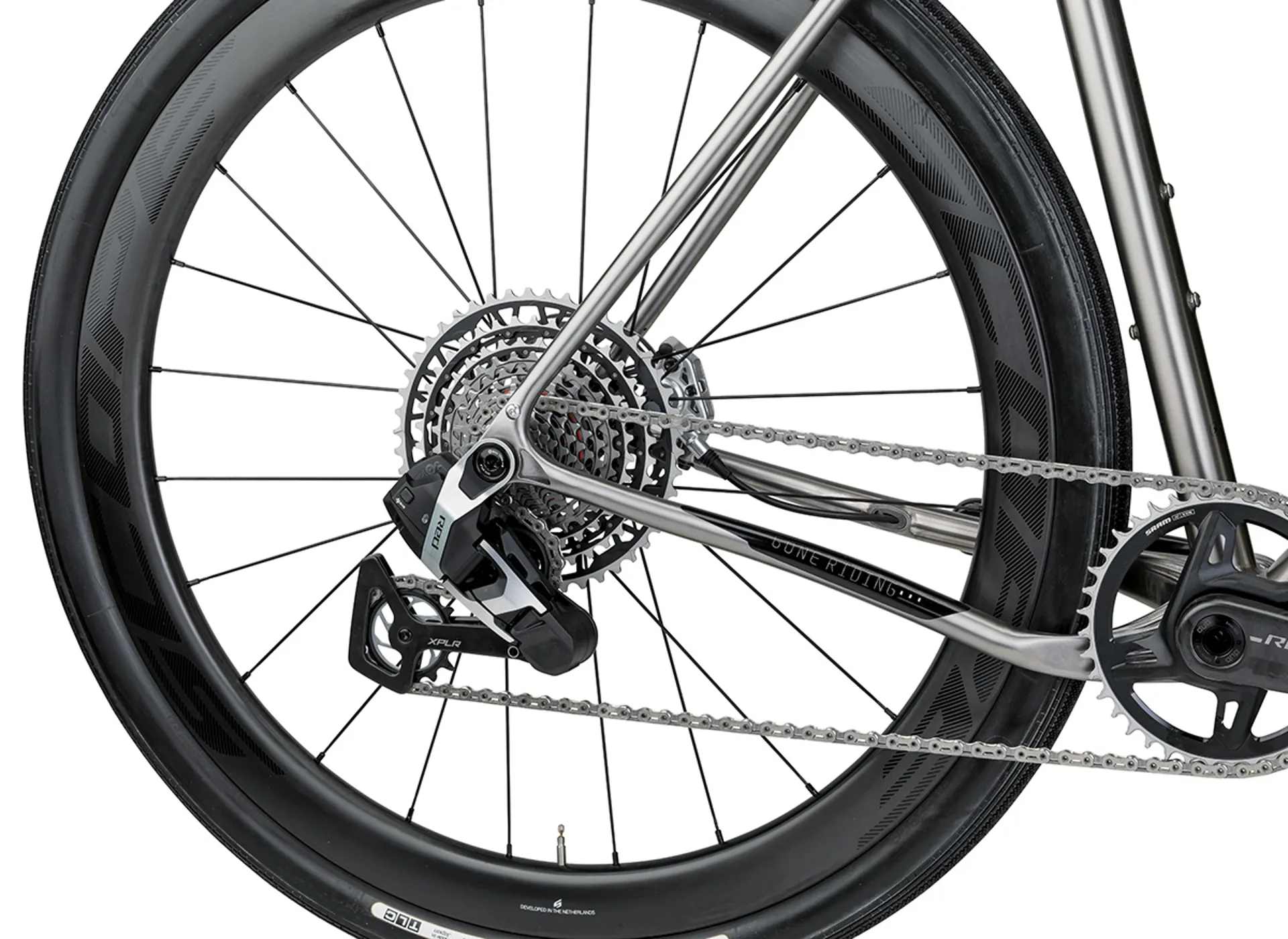 The head tube is also cast and allows for full internal cable routing compatible with both mechanical and Di2 cables. And fully-cast, titanium drop outs allow for Flat Mount Disc Brake System, with thru axles.
